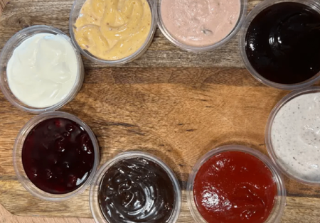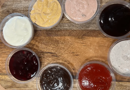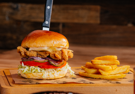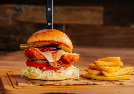 Bułka brioche, panierowane udko z kurczaka w ostrej glazurze, ser gouda, papryczki pepperoni, pikantny sos, sos tysiąca wysp, sałata, ogórek konserwowy, pomidor, cebula, frytki 100g