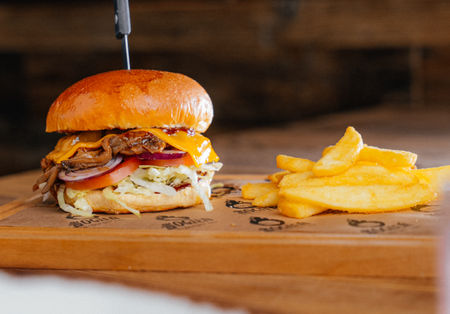 Bułka brioche, 180G szarpanego boczniaka w sosie BBQ, sos chipotle, ser mimolette, sos tysiąca wysp, sałata, ogórek konserwowy, pomidor, cebula, frytki 100g