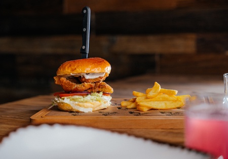 Bułka brioche, bocznik w panierce, sos truflowy, sałata, ogórek konserwowy, pomidor, cebula frytki 100g