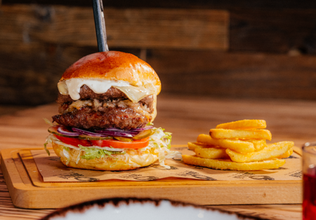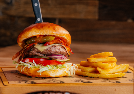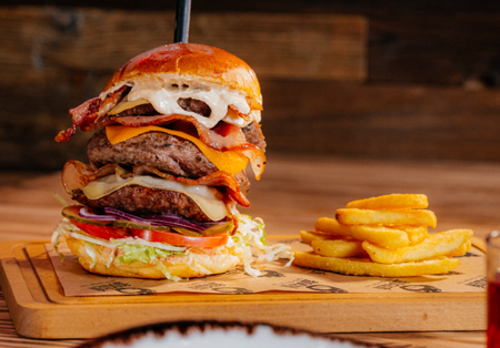 Bułka brioche, 540g wołowiny, 3x ser gouda, 3x boczek, sos tysiąca wysp, sałata, ogórek konserwowy, pomidor, cebula, frytki 100g