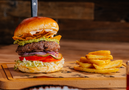 Bułka, 180g wołowiny, majonez chipotle, salsa mango, guacamole, nachosy, sałata, pomidor, ogórek konserwowy, frytki 100g.