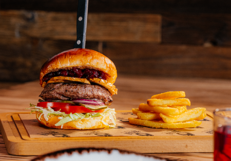 Bułka brioche, 180g wołowiny, ser góralski, konfitura żurawinowa, sos chrzanowy, ogórek konserwowy, cebula czerwona, pomidor, frytki 100g
