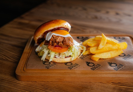 Bułka brioche, 160g szarpana wieprzowina, ser gouda, jajko sadzone, sos BBQ, sałata, ogórek konserwowy, pomidor, cebula, frytki 100g
