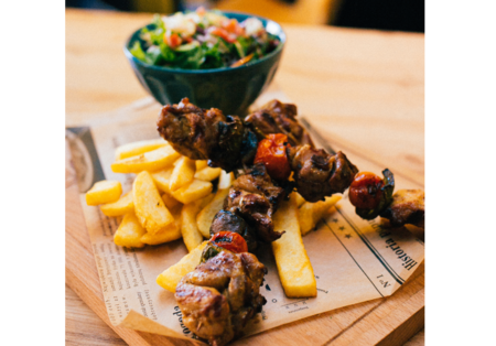 2 SZT SZASZŁYK (Kurczak, pieczarka, papryka, pomidor), frytki, salatka