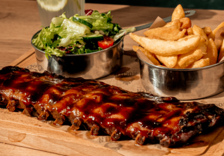 Żeberka w sosie whisky bbq, mix sałat z cebulą, pomidorem, ogórkiem i oliwą, 200g frytek