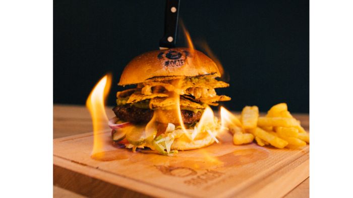 Bułka, 180g wołowiny, majonez chipotle, salsa mango, guacamole, nachosy, sałata, pomidor, ogórek konserwowy, frytki 100g.