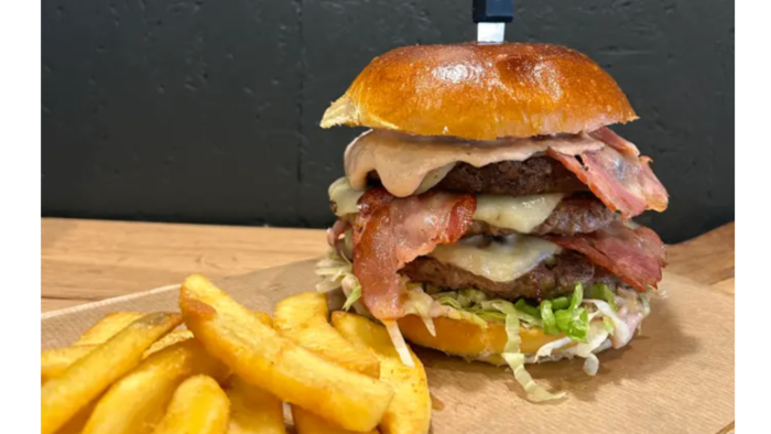 Bułka brioche, 540g wołowiny, 3x ser gouda, 3x boczek, sos tysiąca wysp, sałata, ogórek konserwowy, pomidor, cebula, frytki 100g
