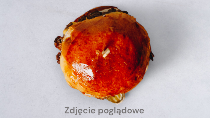 Bułka brioche, 180g wołowiny, ser gouda, boczek, sos whisky bbq, sałata, ogórek konserwowy, pomidor, cebula, frytki 100g