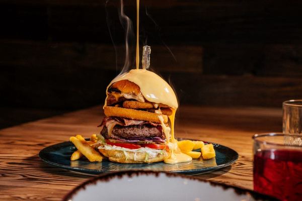 Bułka brioche, 180g wołowiny, ser panierowany, 3x boczek, 3x krążki cebulowe, sos serowy, sos tysiąca wysp, sałata, ogórek konserwowy, pomidor, cebula, frytki 100g